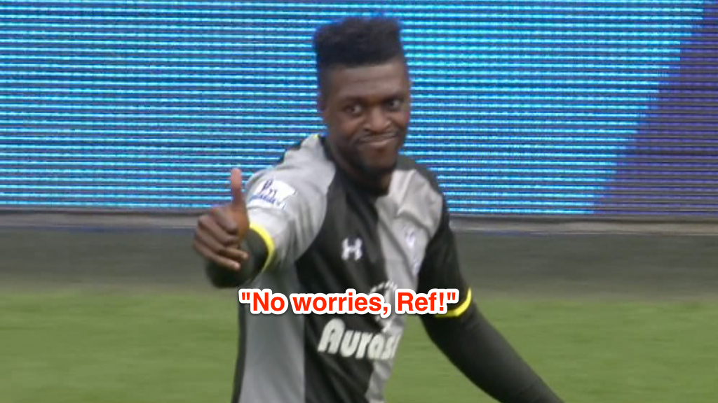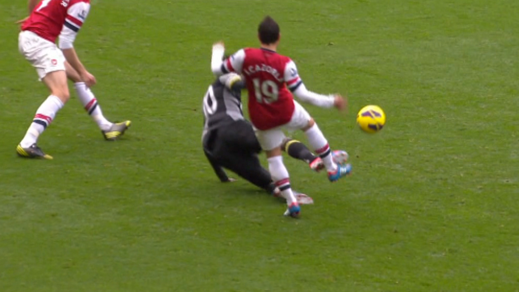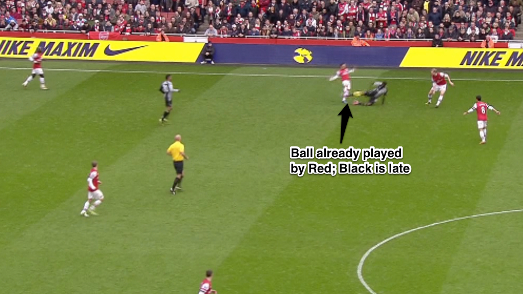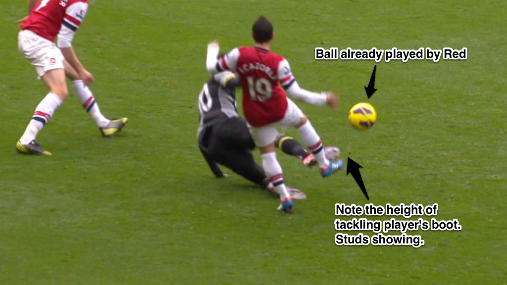 As for the send off itself, it appears to be straightforward enough. Adebayor is clearly late with his tackle, leg “locked” and studs showing high. This is a clear cut case of serious foul play for which a send off is warranted.