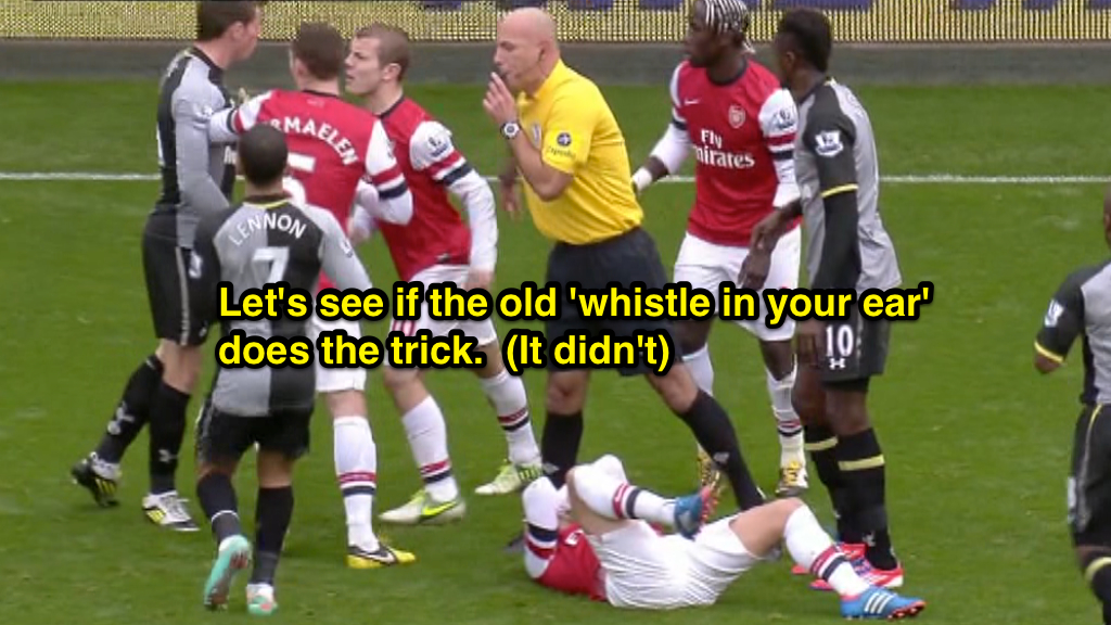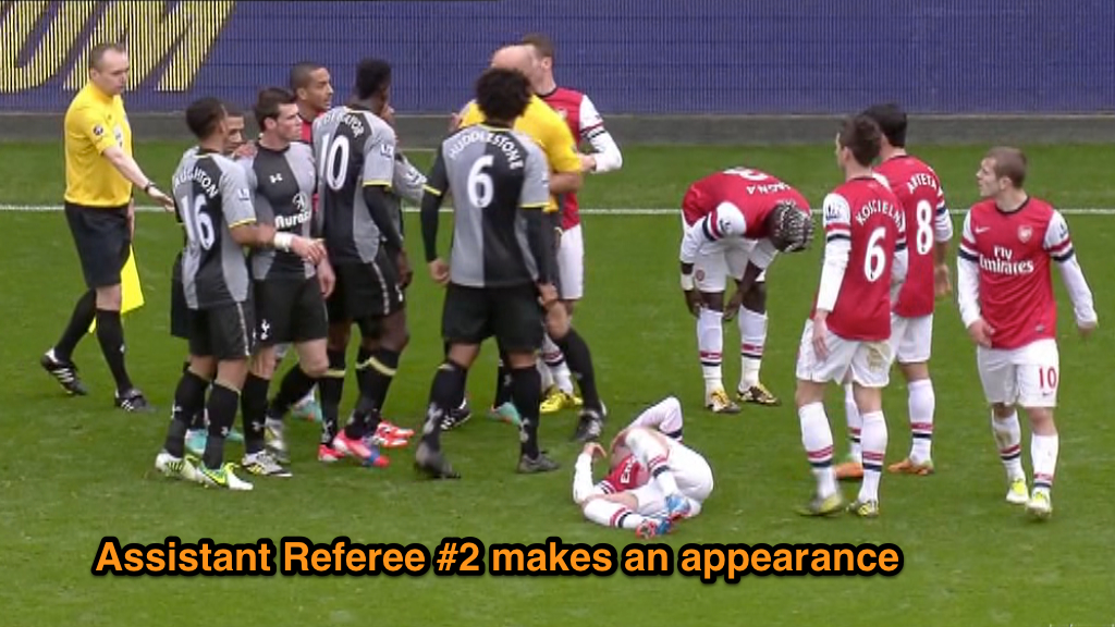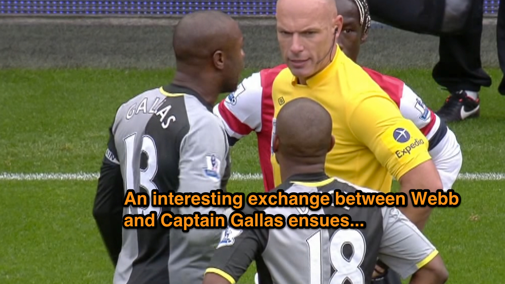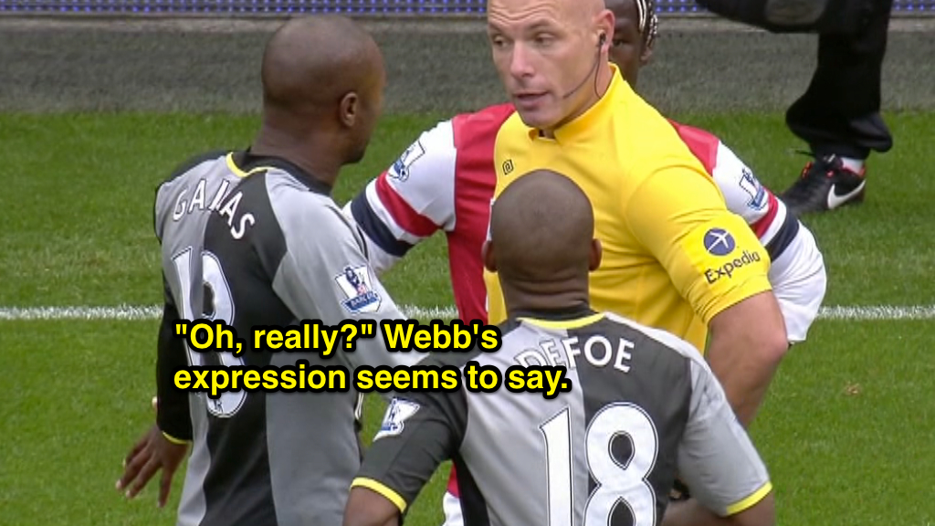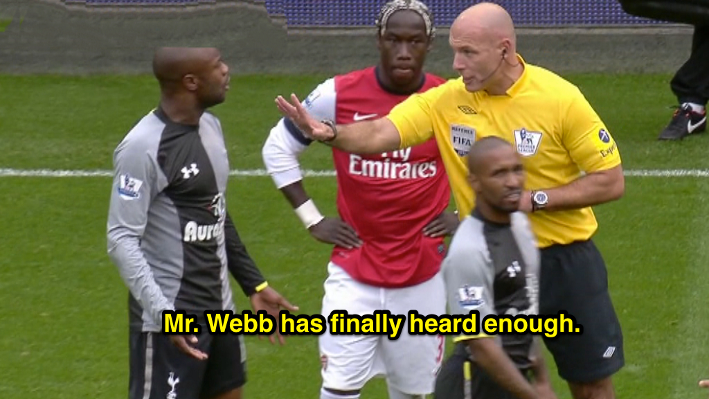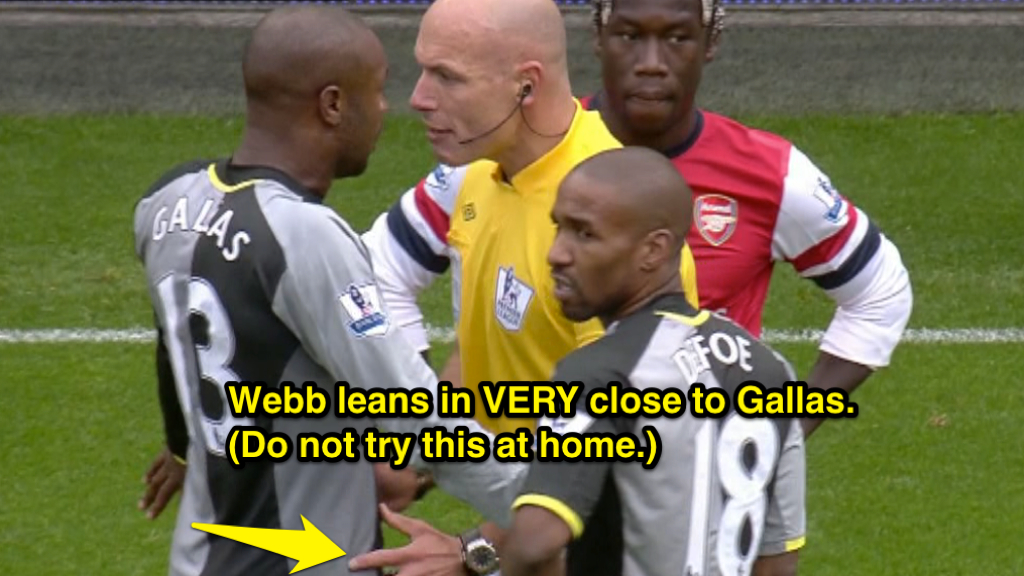 After Adebayor is finally dismissed, Webb engages in a rather lengthy discussion with Spurs captain William Gallas. Gallas clearly isn’t happy with the sending off (when are they ever?) and the referee shows quite a bit of patience in listening to the player. Webb also uses a technique not available to those of us in the youth game, namely, touching the player and leaning in very close to make a point. (Any lip readers out there?)