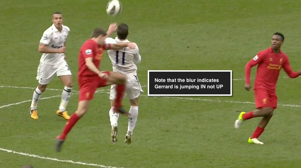 Just a couple of minutes later, Liverpool captain Steven Gerrard came in hard on Spurs’ emerging superstar Gareth Bale for a ball in the air. Gerrard led with his arm, and jumped inwards instead of upwards, catching Bale on the side of the head. This was clearly a case where a caution would have been fully warranted, but Oliver again elects to keep his cards in his pocket. I wonder if he was thinking how he was going to need Gerrard to help manage the match? Regardless, this “investment” paid off, as we shall see.